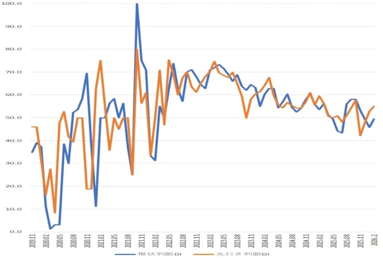 ガソリン暫定税率(25.1円/L)は2025年12月31日に正式に廃止されました。2月の「ガソリン」関連DIは現状55.6、先行き58.9でどちらも50超になり、景況感の押し上げ要因になりました。