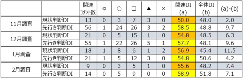 「衆議院選挙の影響もあって、来客数がやや少なくなっている」という北海道のスナック経営者の「やや悪くなった」というコメントに代表されるように、衆議院選挙が行われることにより悪影響を受ける業種があります。そのため、2月の「衆議院選挙」関連現状判断DIは45.5と50割れになりましたが、「衆議院選挙」関連先行き判断DIは58.6と50を上回りました。