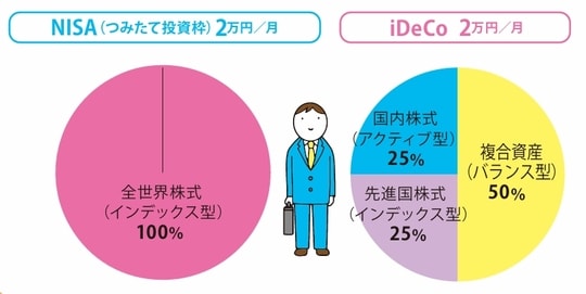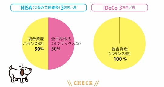 こうした事情を考えると、短~中期的な資産づくりと長期的な資産形成の両方が欠かせません。積み立ては、老後の資産形成を優先として、iDeCoはNISAと同額の月3万円を積み立てましょう。バランス型でも比較的株式の比率が高めの積極型を選びます。