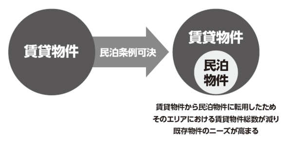 民泊条例が普及することによって、賃貸市場からホテルに転用される物件が一定数出ることにより、賃貸物件の総数が減ります。民泊としてホテル代わりに転用される物件は、外国人が迷わないよう利便性を備えた駅近物件に代表されるような好立地であることが必要なため、賃貸市場から魅力的な物件が一定数減ってしまうことが予想されるでしょう(図表参照)。賃貸市場から魅力的な物件がなくなれば、当然、残りの物件に対して賃貸需要が集中し、相対的に家賃が上がることも十分に考えられます。