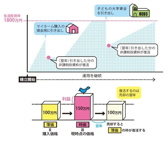 NISAでは、売却すると、その分の非課税投資枠が翌年に復活します。住宅資金を引き出したら次は教育資金、そのあとは老後資金と生涯を通して活用できるのです。