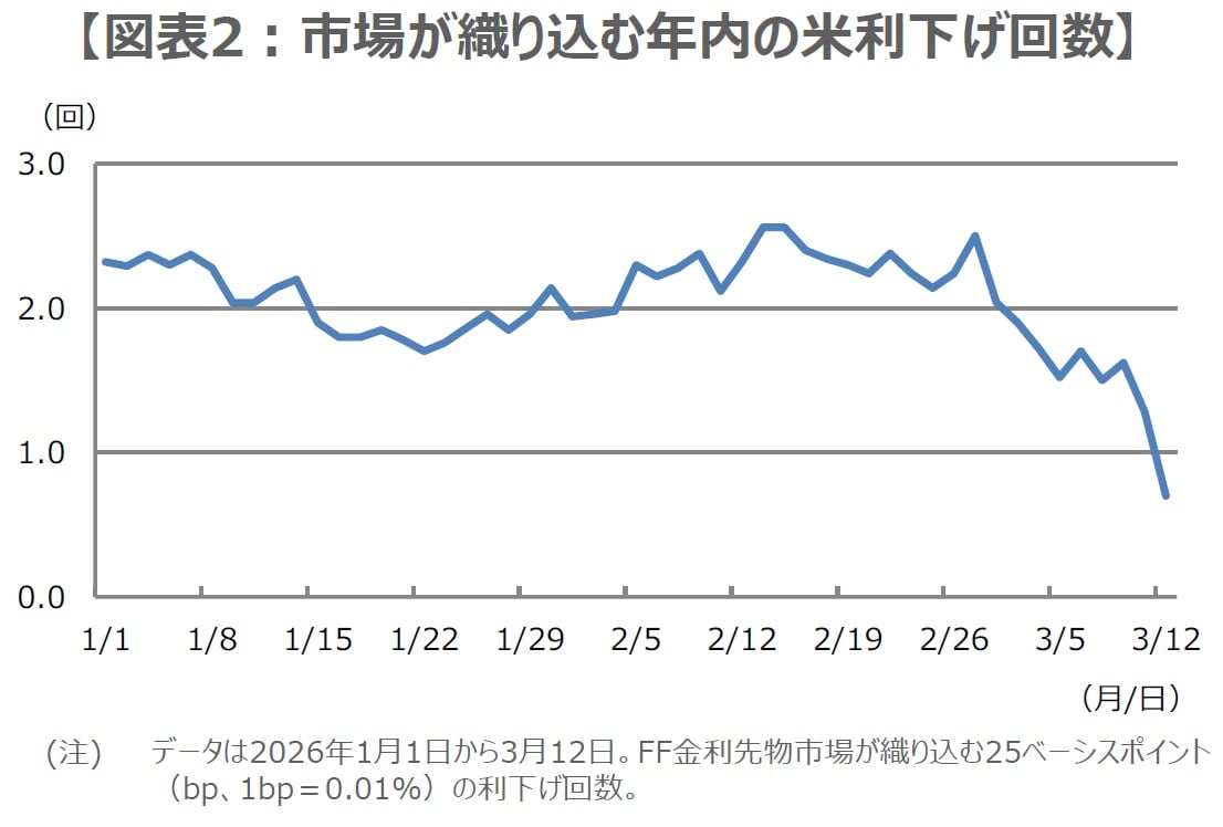今回のFOMCでは、当面イラン情勢の先行きと原油高の影響を見極める姿勢が確認されるとみられ、FF金利先物市場でも、年内25bpの利下げの織り込み回数が低下し、利下げ観測が後退しています(図表2)。なお、米国の金融政策について、弊社では2026年いっぱい利下げは見送られ、利下げ再開は2027年に入ってからと予想していますが、現時点でもこの見方に変更はありません。