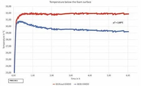 放熱シートを採用したZUKAN フトンと放熱シートを採用しない敷寝具で、表面温度の変化を見た。6時間経過後、ZUKAN フトンの表面温度は放熱シートを使用しない時と比べて2.6℃低かった。(ラジテック製造元調べ)