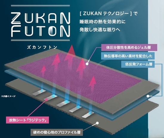 さらに、ZUKAN PILLOWでも好評だったジェル層が体圧を分散、加えてフトンとの密着を防ぐことで、放熱効果をより高める仕組みに。