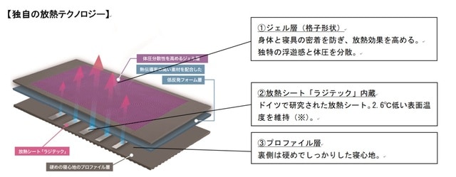 ZUKANフトンには、ドイツで研究開発された独自の放熱シート「ラジテック」を内蔵。睡眠中の寝具内にこもる熱を自然に逃がし続け、寝床内の環境を整えます。