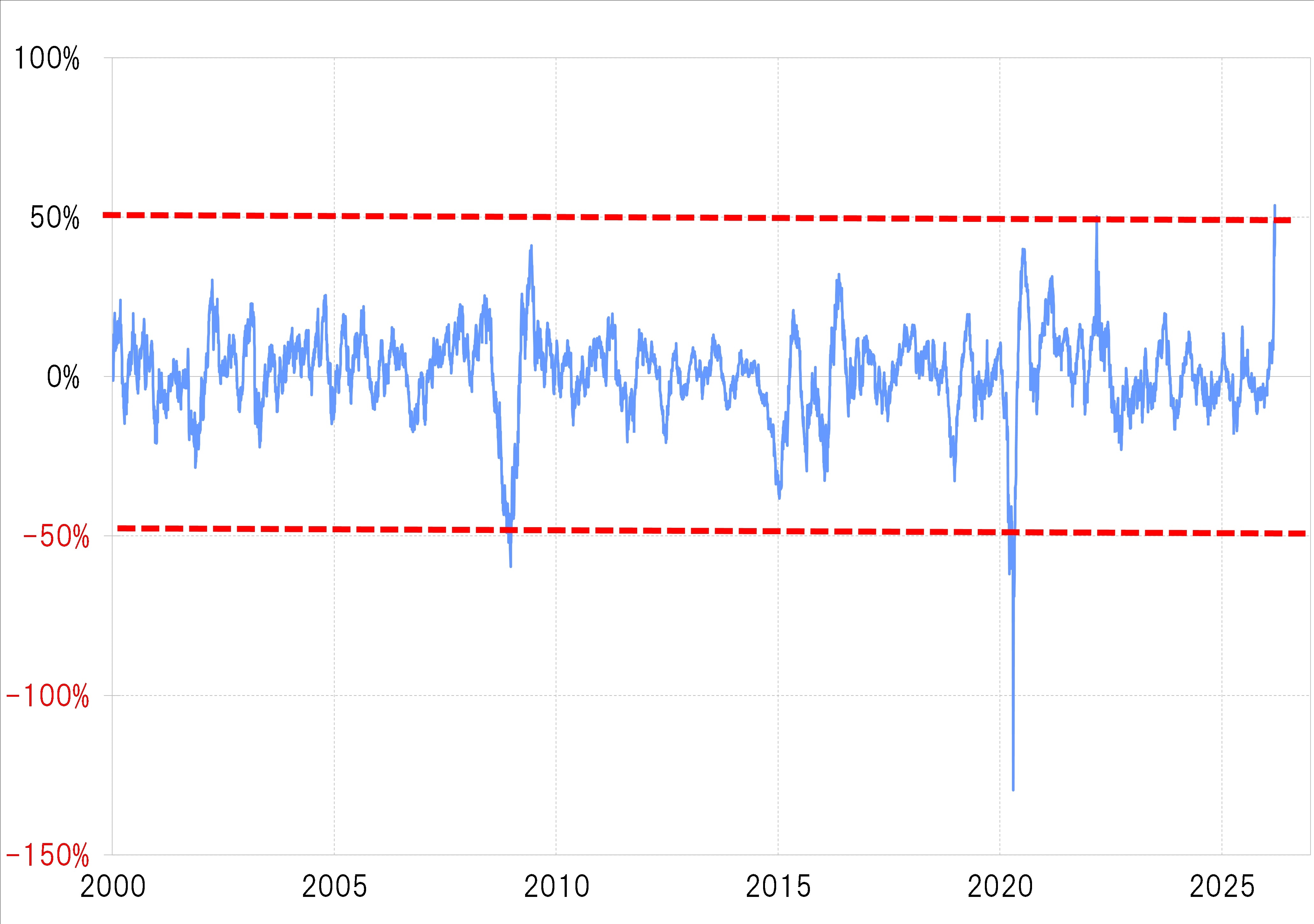 ただしそんな原油価格上昇も、短期的にはさすがに「行き過ぎ」懸念がかなり強くなってきたようです。WTI(ウエスト・テキサス・インターミディエイト)の90日MA(移動平均線)かい離率は先週50%以上に拡大し、2022年のロシアによるウクライナ侵攻局面での記録を上回り、2000年以降では最高となりました(図表6参照)。別の言い方をすると、2000年以降で最も短期的「上がり過ぎ」懸念が強くなったわけなので、そろそろ原油価格上昇が一段落してもおかしくないのではないでしょうか。