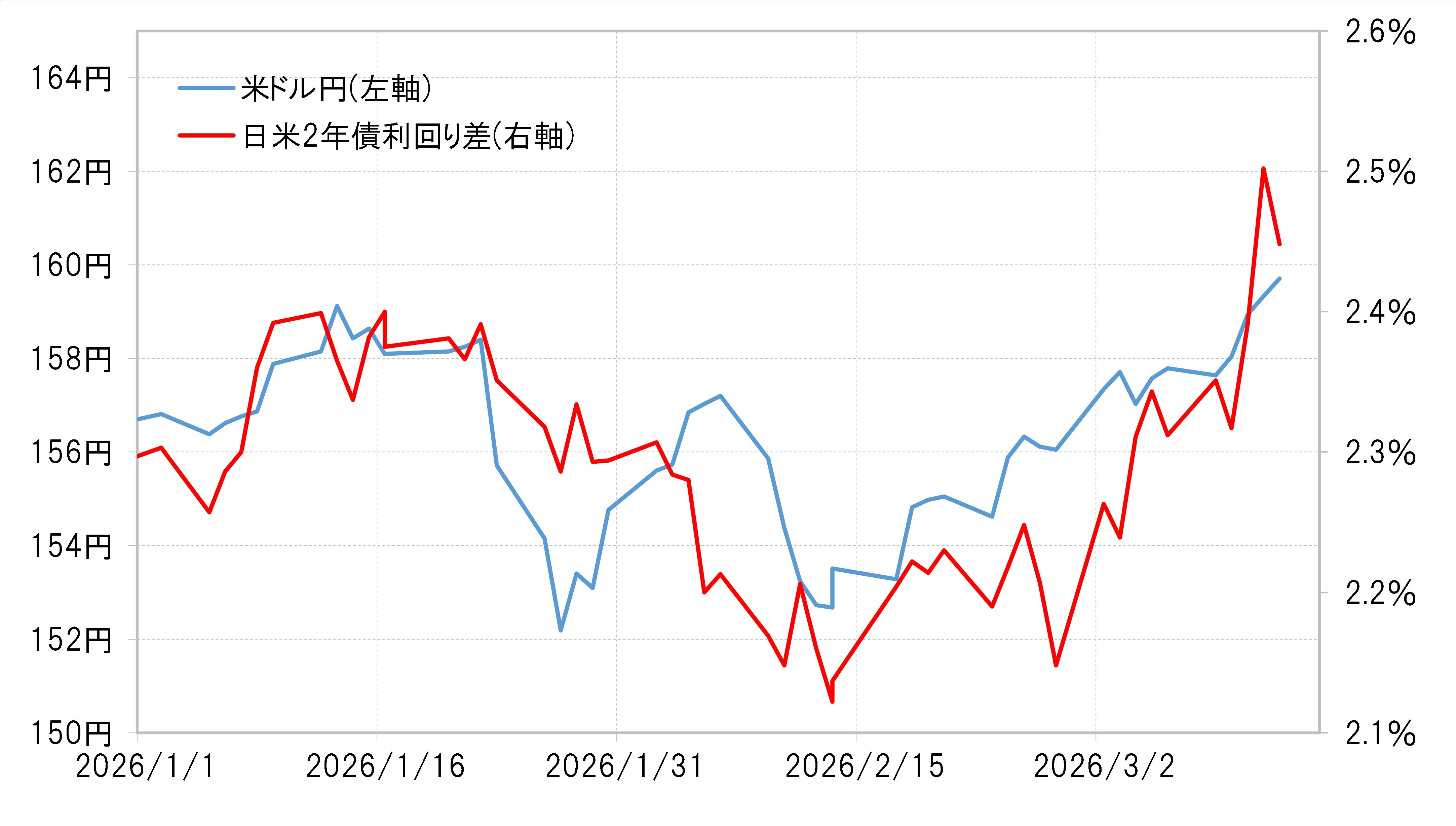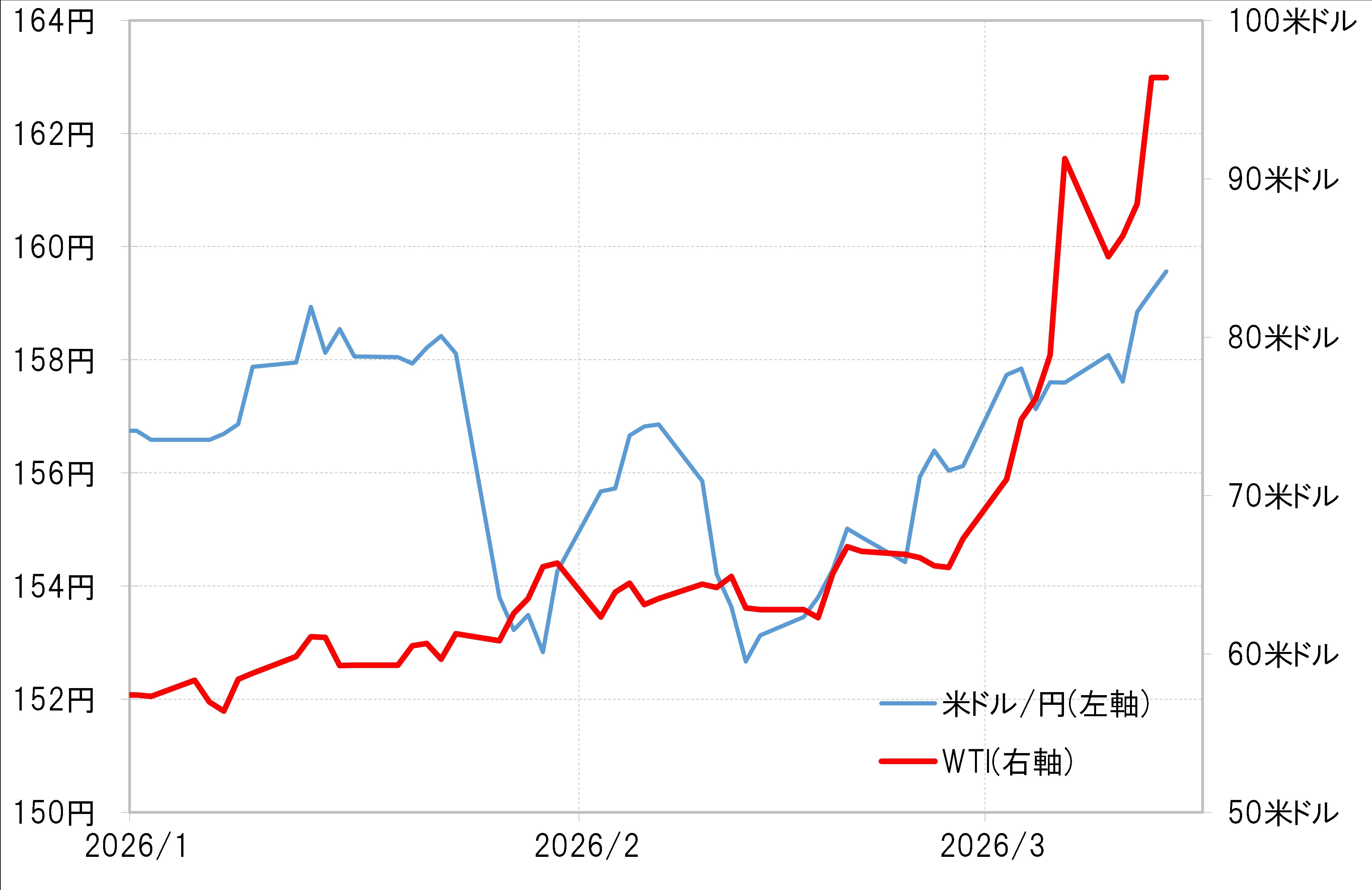 先週の米ドル/円は上昇傾向が続き、この間の高値を更新し160円の大台に迫る展開となりました(図表1参照)。イランによるホルムズ海峡封鎖が続くなかで原油価格の上昇が続き、原油等のエネルギー供給リスクに弱い円が売られる一方で、「世界一の産油国」米国の米ドルが買われる流れが継続したということでしょう。