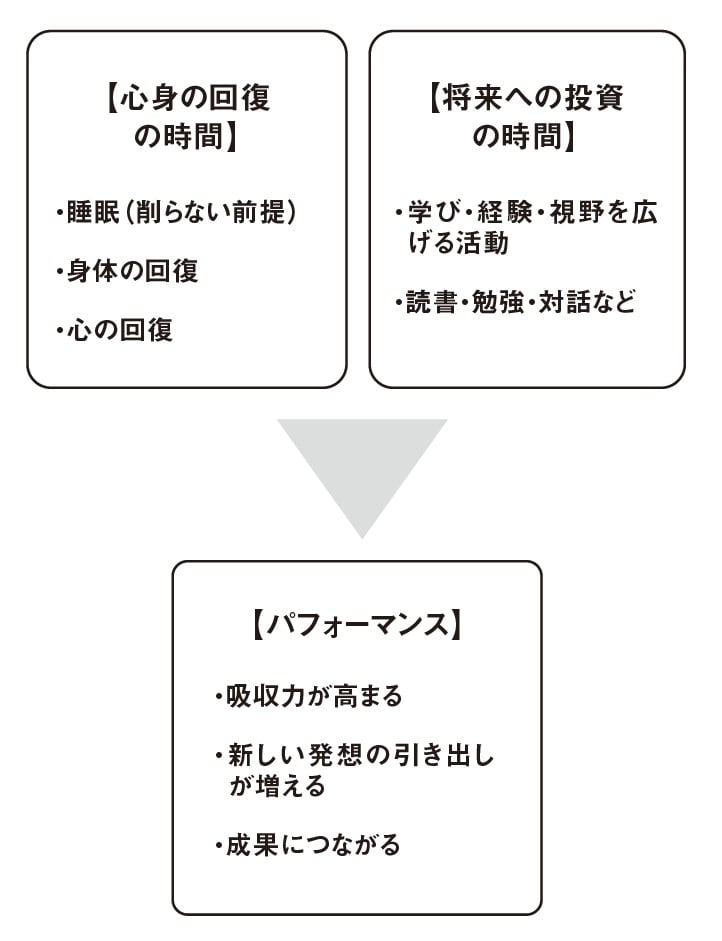 「心身の回復の時間」と「将来への投資の時間」のバランスは、人それぞれだと思います。私の場合、たとえば休みの日の24時間のうち、「睡眠時間」が9時間、「身体の回復の時間」が2時間、「心の回復の時間」が2時間、「将来への投資の時間」が6時間、そして残りの5時間がその他生活のための時間。