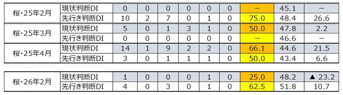 桜の開花が3月29日と遅かった2025年3月の景気ウォッチャー調査で「桜」関連判断DIをつくると、現状判断DIは50.0(回答ウォッチャー5人)、「桜」に関する先行き判断コメントはありませんでした。