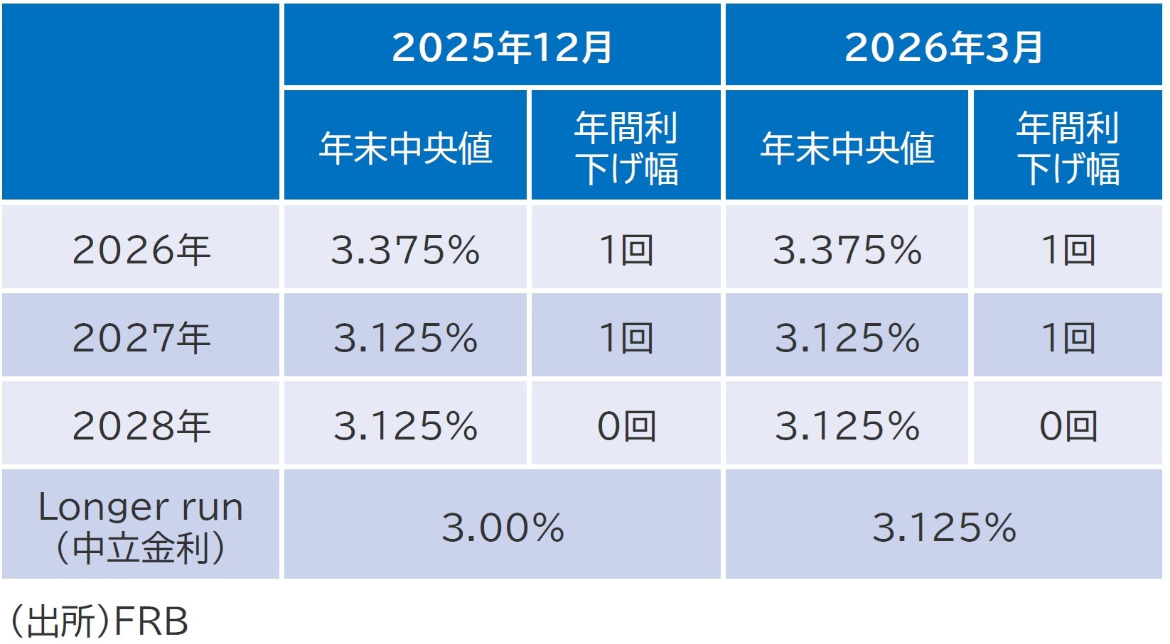 一方、インフレ率の見通しも上方修正されており、会合後の記者会見でパウエル議長は、関税によるコア財価格の上昇を主な要因として挙げるとともに、原油高に伴う短期的な期待インフレ率の上昇についても指摘しました。FOMC参加者による政策金利予想(ドットチャート)の中央値は、2026年、2027年について、昨年12月の会合と同様にそれぞれ年1回の利下げが示唆されました(図表3)。