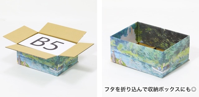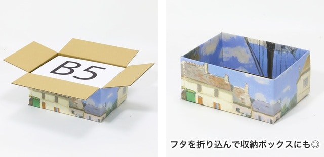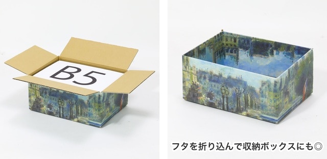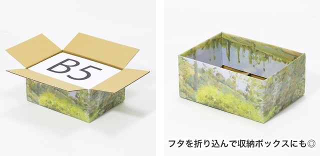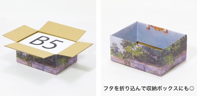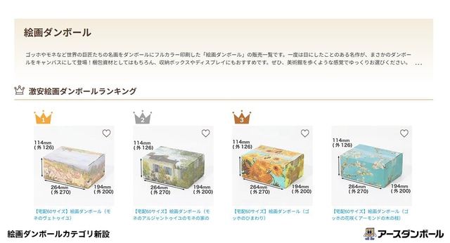 ゴッホやモネなど世界の巨匠たちの名画をダンボールにフルカラー印刷した『絵画ダンボール』の販売ページを用意。一度は目にしたことのある名作が、ダンボールをキャンバスにして続々登場。