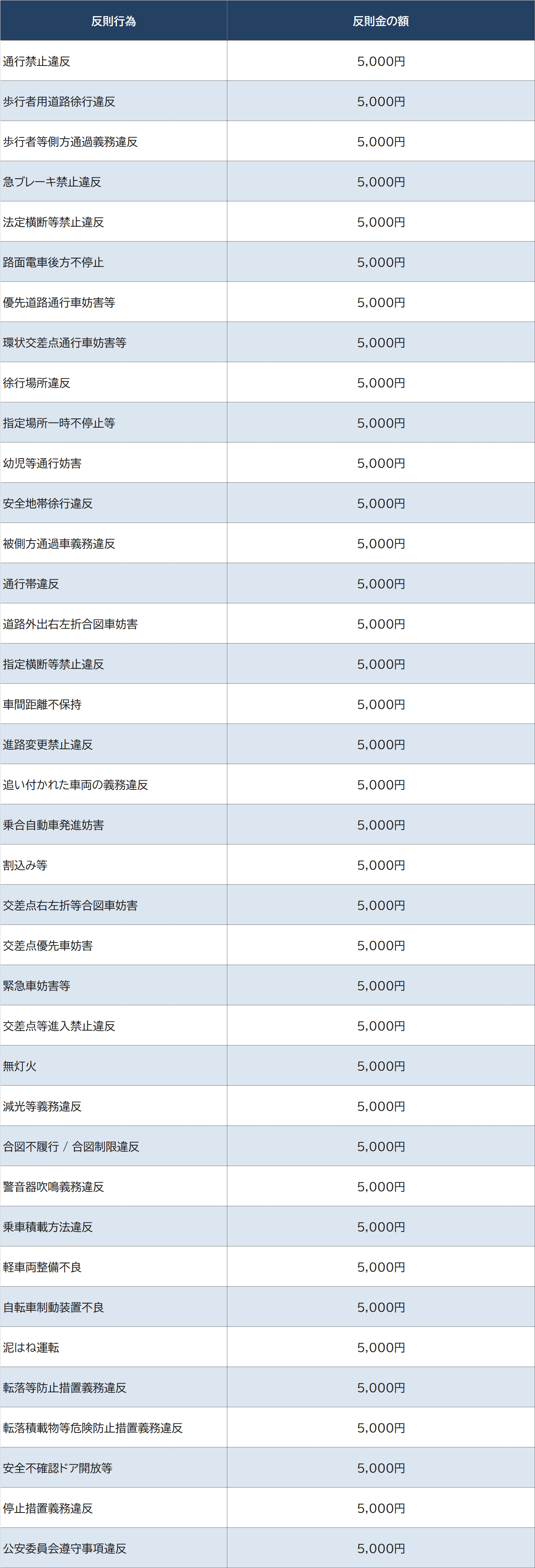 自転車が対象とされる反則行為(反則金5,000円)