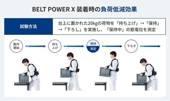 アシストスーツ「BELT POWER X」の負荷低減効果を検証する為に、筋電位測定を実施。