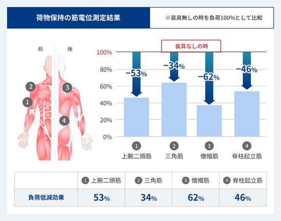 測定結果として上腕二頭筋及び僧帽筋の負荷が50%以上低減する等、複数箇所での負荷低減効果を確認しました。