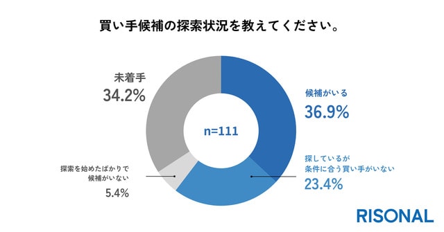 買い手候補の探索状況として、最多は「候補がいる」の36.9%だが、一方で「未着手」も34.2%と高い割合に。「探しているが良い買い手が見つからない」も2割強にのぼった。