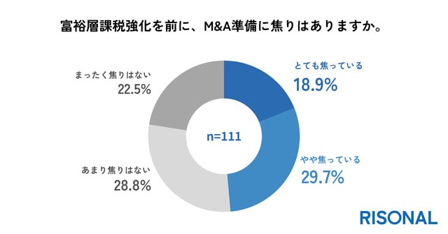 富裕層課税強化を前にしたM&A準備状況に焦りがあるか尋ねたところ、「とても焦っている」が18.9%、「やや焦っている」が29.7%で、約半数が焦りを感じていることがわかった。