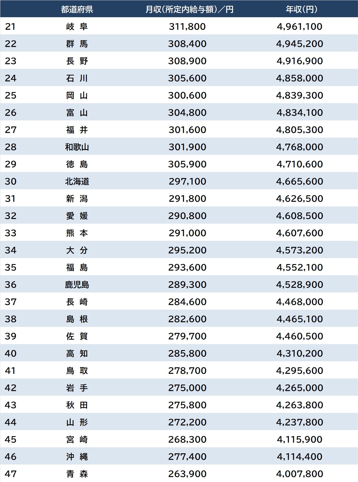 エトセトラ 統計 シェア Tweet [連載] 統計から紐解く日本の実情…統計・調査・ランキング資料 【ランキング】都道府県別「会社員の平均年収」1~47位…〈令和7年賃金構造基本統計調査〉 SGO編集部 2026.3.26 統計 調査 都道府県別「会社員の平均年収/男女計」21~47位 出所:厚生労働省『令和7年賃金構造基本統計調査』