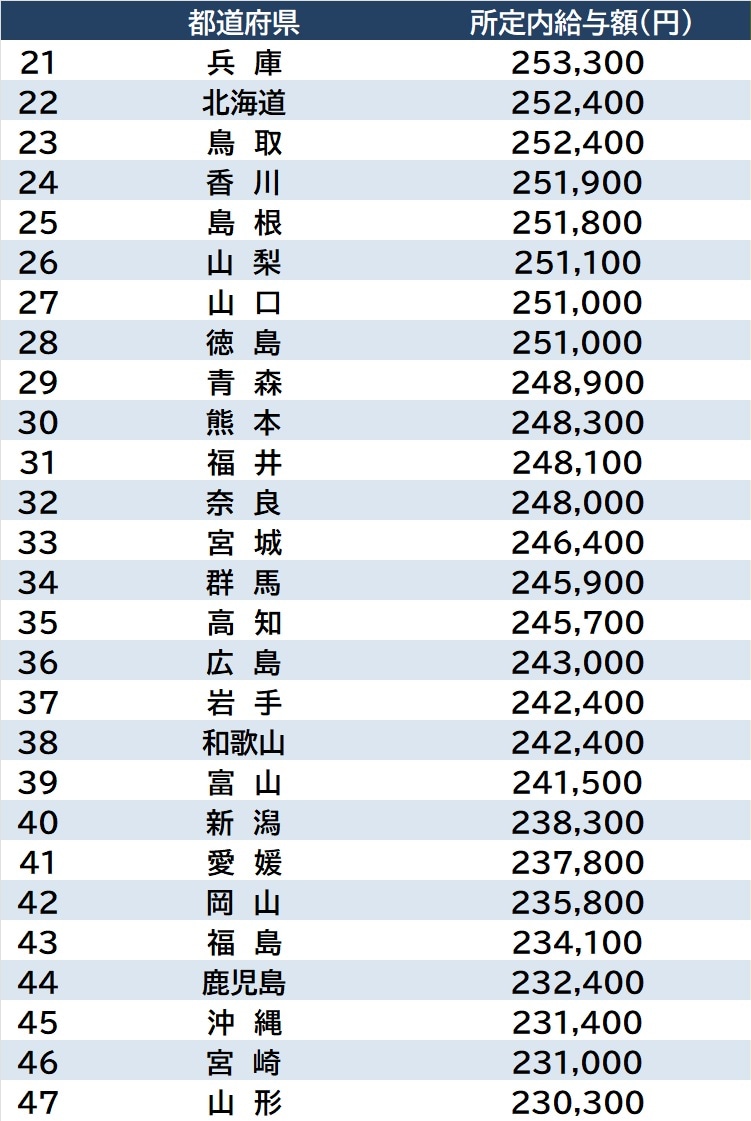 エトセトラ 統計 シェア Tweet [連載] 統計から紐解く日本の実情…統計・調査・ランキング資料 【ランキング】都道府県別「大卒初任給」1~47位…〈令和7年賃金構造基本統計調査〉 SGO編集部 2026.3.27 統計 調査 都道府県別「新規大卒者平均月収/男女計」21~47位 出所:厚生労働省『令和7年賃金構造基本統計調査』大卒初任給=新規学卒者(大学)の平均給与
