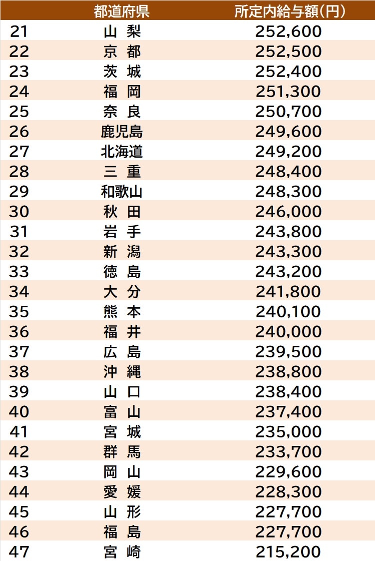 エトセトラ 統計 シェア Tweet [連載] 統計から紐解く日本の実情…統計・調査・ランキング資料 【ランキング】都道府県別「大卒初任給」1~47位…〈令和7年賃金構造基本統計調査〉 SGO編集部 2026.3.27 統計 調査 都道府県別「新規大卒者平均月収/女性」21~47位 出所:厚生労働省『令和7年賃金構造基本統計調査』大卒初任給=新規学卒者(大学)の平均給与