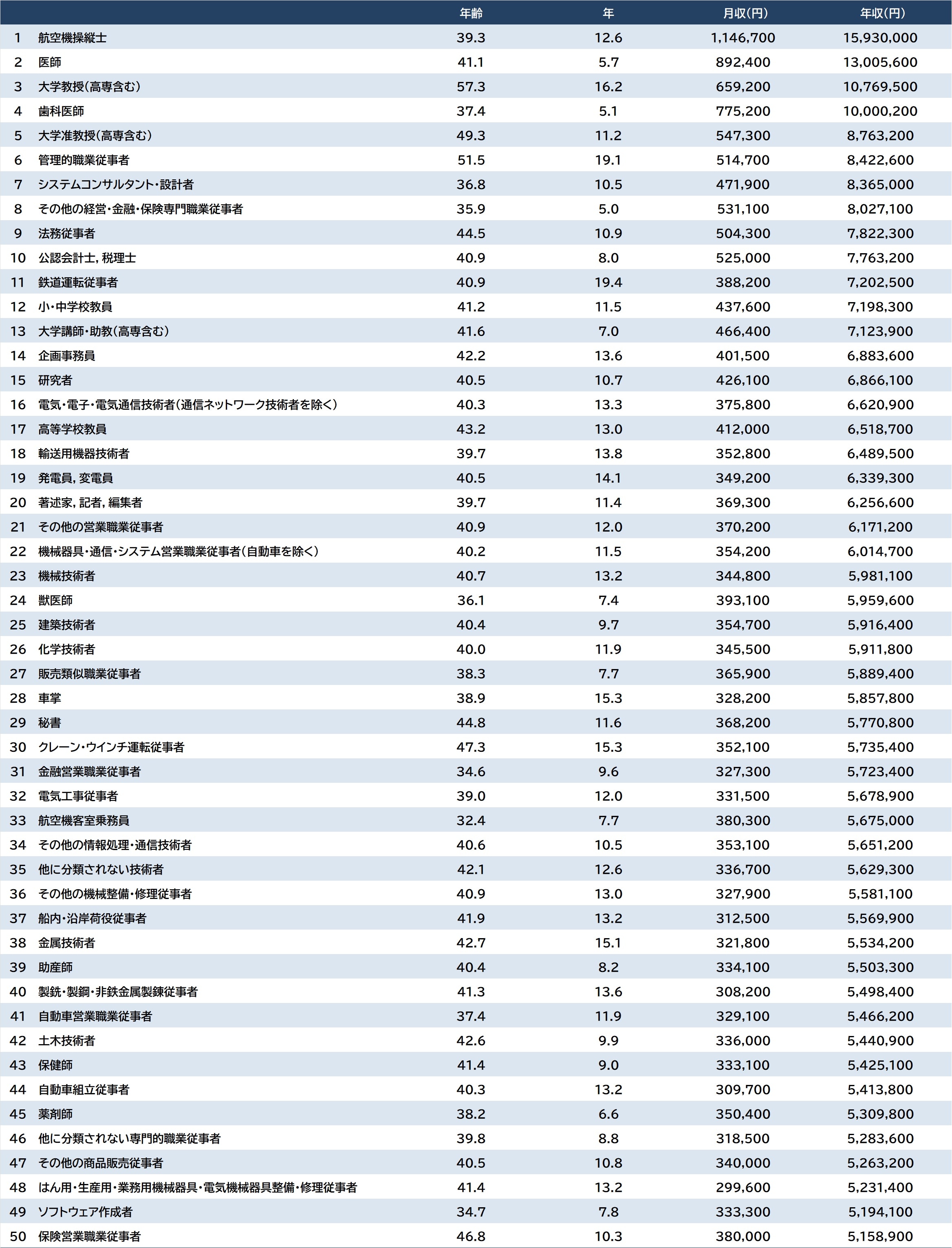 エトセトラ 統計 シェア Tweet [連載] 統計から紐解く日本の実情…統計・調査・ランキング資料 【ランキング】職種別「平均給与」1~144位…〈令和7年賃金構造基本統計調査〉 SGO編集部 2026.3.27 統計 調査 職種別「平均給与(男女計)」1~50位 出所:厚生労働省『令和7年賃金構造基本統計調査』