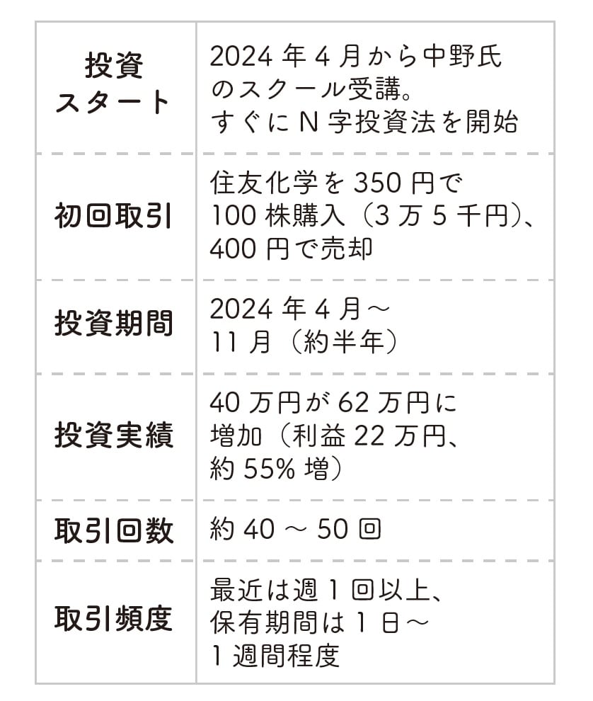 Aさんはこの半年先生の教えを忠実に守って取引をしています。最初の取引は3万5000円でスタートしましたが、少しずつ利益が増えていき、入金額もそのたびに少しずつ増やしていきました。1カ月後くらいにこれは行けると思って、40万円を軍資金にすると決めて、半年経ってみたら追加資金なしで、22万円増えていました。なんと55%の増益ということになります。