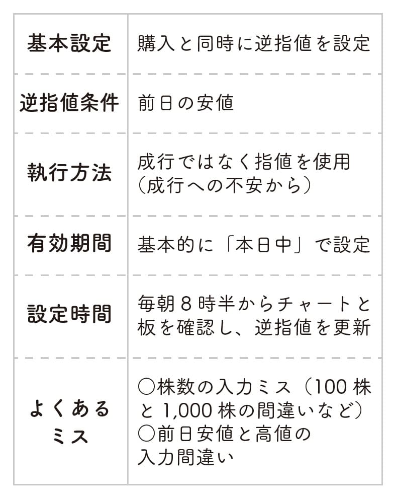 基本的には前日の安値を逆指値価格として毎朝8時30分に入力しているというAさん。始値、終値など関係なく、前日の安値を入力するようにしているそうです。