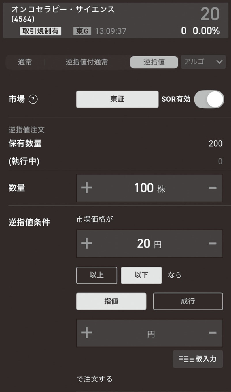 1.該当銘柄の取引画面を開くと一番上に「逆指値」という欄があるので、そこをタップ(〇がついているところ)。株価22円のオンコセラピー・サイエンス(4564)