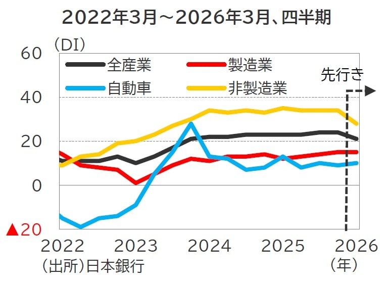 足もとの中東情勢緊迫化に伴うエネルギー価格上昇への懸念が景況感の重石となるなか、大企業製造業はAI関連需要が下支えになると予想しています(図表2)。
