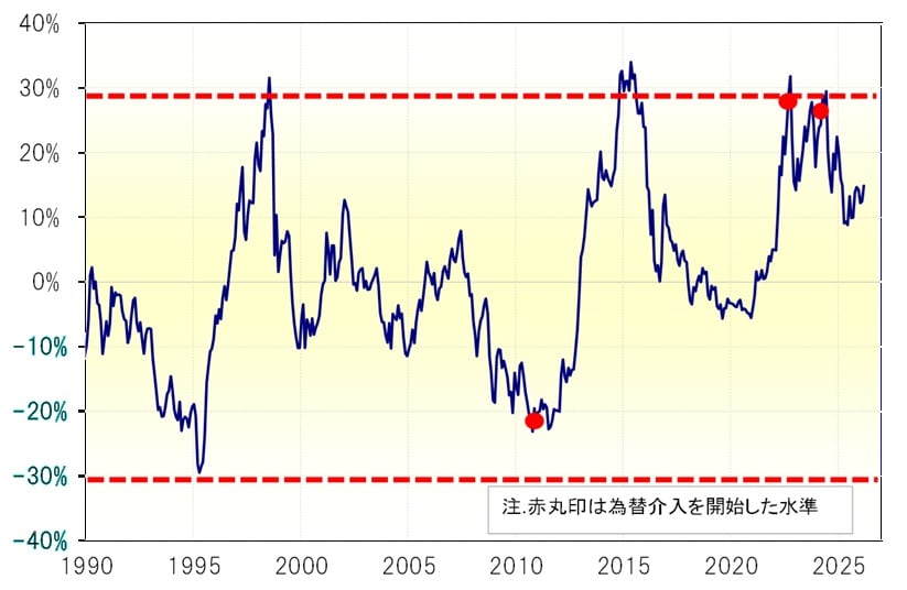 規模が巨大な為替市場において、介入だけで相場の流れを転換させるのは容易ではありません。ただし、これまでの実績を見る限り、米ドル/円は5年MA±3割以上にかい離するケースはほとんどなく、2~3割のかい離が“行き過ぎ”の限界圏だったとみられます。