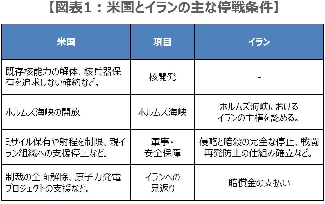 一方、パキスタンのダール副首相兼外相は3月29日、近日中にパキスタンの首都イスラマバードで、米国とイランによる和平協議を主催すると述べており、協議が進む可能性も残されています。米国とイランの間では、停戦の条件で隔たりがあるものの(図表1)、協議が着実に進展していけば、原油高が一服し、156円水準(イラン攻撃前の2月27日のニューヨーク市場終値)に向かって、徐々にドル安・円高が進むことも想定されます。