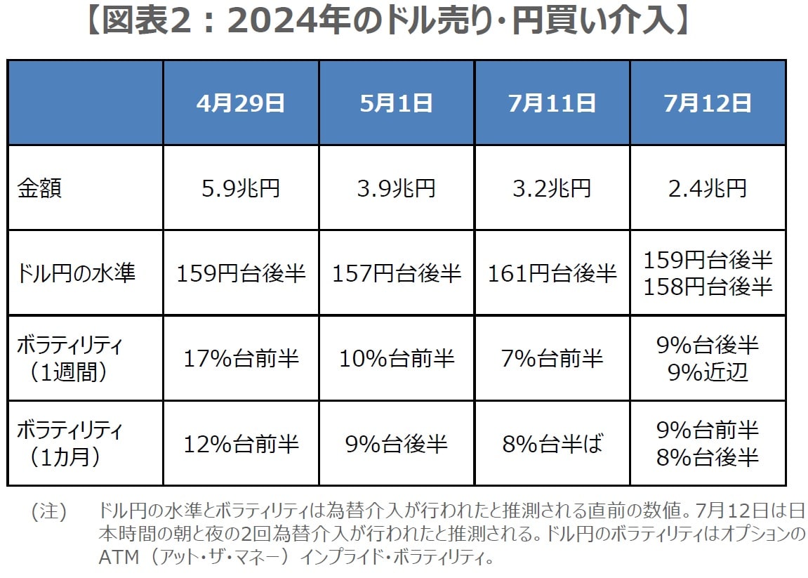 ドル円が1年8カ月ぶりのドル高・円安水準をつけたことで、今週は改めて、政府・日銀による為替介入の有無に市場の焦点が集まっています。直近では2024年にドル売り・円買いの為替介入が行われましたが(図表2)、現時点でドル円は160円をつけており、足元のボラティリティは期間1週間、1カ月ともに10%を超えていることから、為替介入が行われても違和感のない状況です。