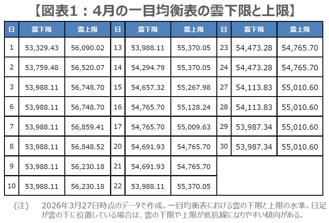一方、米国とイランの和平協議が着実に進展していけば、原油高が一服し、日経平均は急速に値を戻すことも十分想定されます。その場合、一目均衡表の雲が、日経平均の抵抗帯になる恐れがあるため、まずは4月中旬にかけて、日経平均が雲の下限である54,000円水準をしっかり回復し、4月30日時点で雲の上限である55,000円水準を上抜けられるかが焦点になると思われます(図表1)。