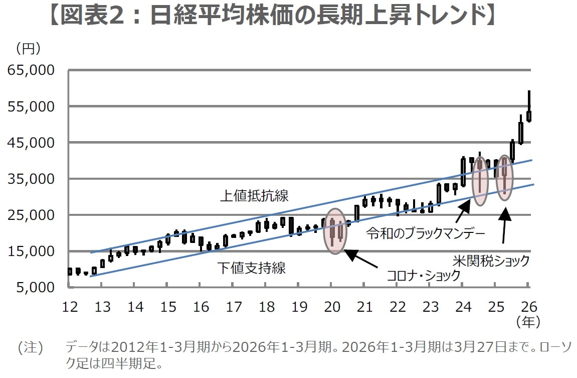前述の3月10日付レポートで、日経平均の長期上昇トレンドの図表を掲載しましたが、改めて再掲します(図表2)。日経平均は2025年7-9月期から、これまでの長期上昇トレンドの上値抵抗線を明確に上抜け、より右肩上がりの新たな上昇トレンドを形成しつつあります。そのため、日経平均が足元で一段安となっても、長期的な上昇トレンドが大きく崩れる恐れは小さいと考えています。