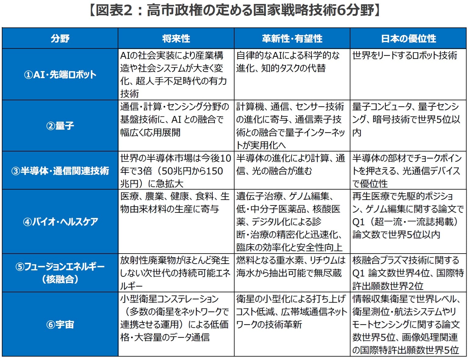 高市政権の成長戦略では、投資にメリハリを利かせるため「17の戦略分野」の中から将来性、技術の革新性・有望性、日本の持つ優位性の観点から「6つの戦略技術」を選び、重点的に投資を行います。具体的には、(1) AI・先端ロボット、(2)量子、(3)半導体・通信関連技術、(4)バイオ・ヘルスケア、(5)フュージョンエネルギー(核融合)、(6)宇宙、の「国家戦略技術6分野」にターゲットを絞り込み、成長戦略が実行されることとなります(図表2)。