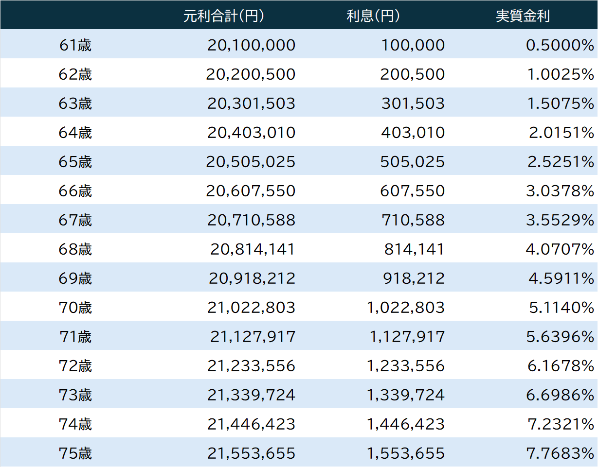 年利0.5%、複利周期1年の場合