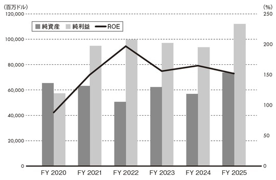 2025会計年度(Fiscal Year 2025) の純利益(Net Income)は約1,120億ドルと初めて1,000億ドルの大台を突破しましたが、2020年度以降はほぼ1,000億ドルに迫る利益をあげてきたことが[図表1・2]からもわかるでしょう。