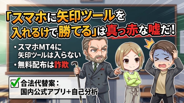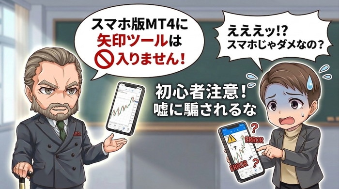 スマホアプリはMetaQuotes社が提供する公式アプリで、外部のプログラムファイルを追加するための仕組みが設計上含まれていない。つまり「スマホ版MT4に矢印ツールをインストールする」という行為自体が技術的に不可能だ。