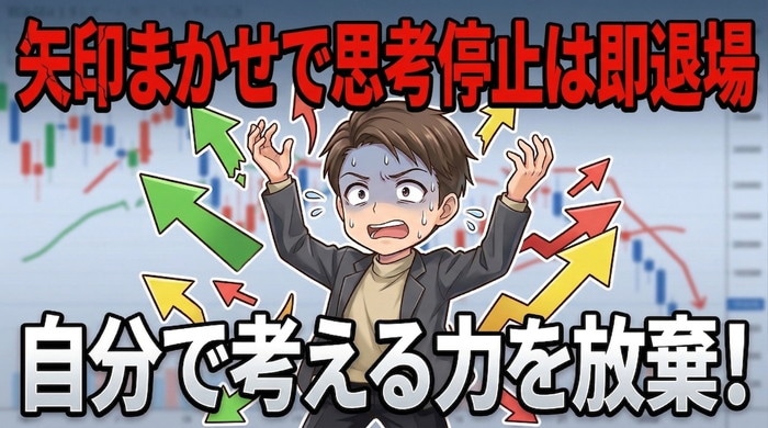 矢印ツールに依存すると、自分で相場を読む力が一切育たない。ツールが機能しなくなった瞬間(そして必ずその日は来る)、何を基準にエントリーすればいいのかわからなくなる。判断基準がゼロの人間が相場に残り続けることは不可能だ。