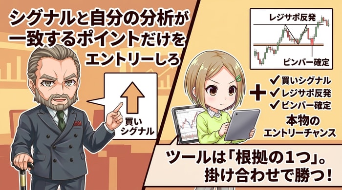 ツールのシグナルは「根拠の1つ」であって「全部」ではない。自分のチャート分析とツールのシグナルが同じ方向を向いた時だけが、本物のエントリーチャンスだ。