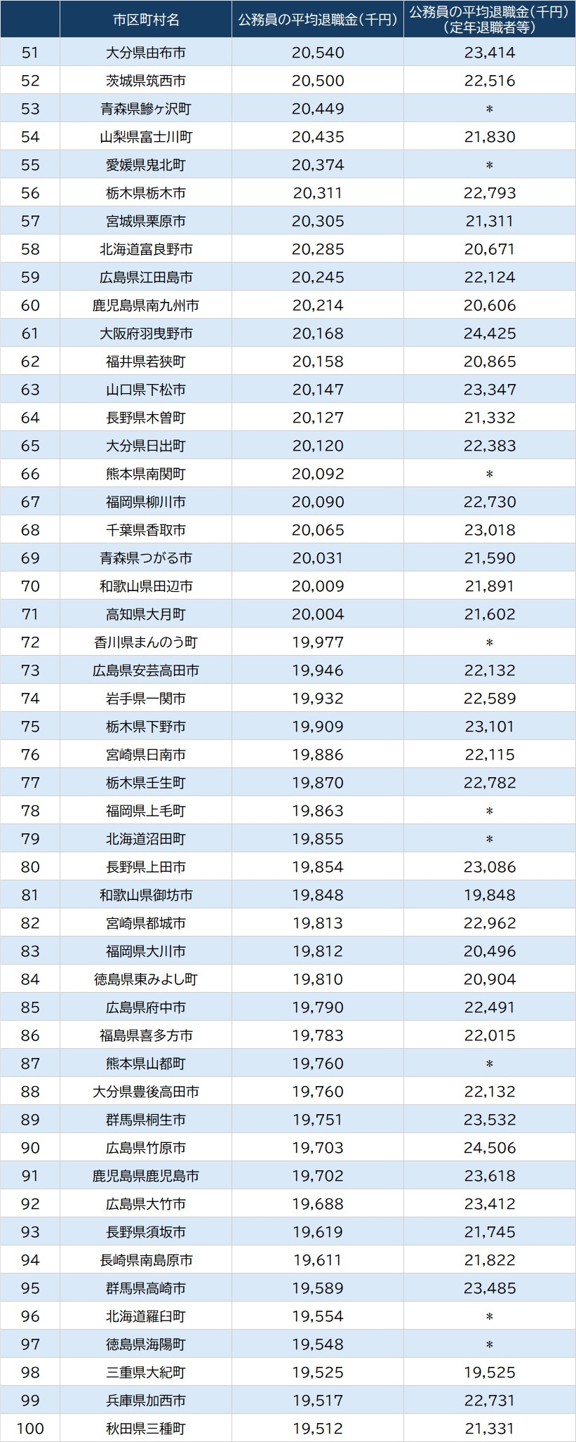 市区町村「公務員の平均給与」51~100位