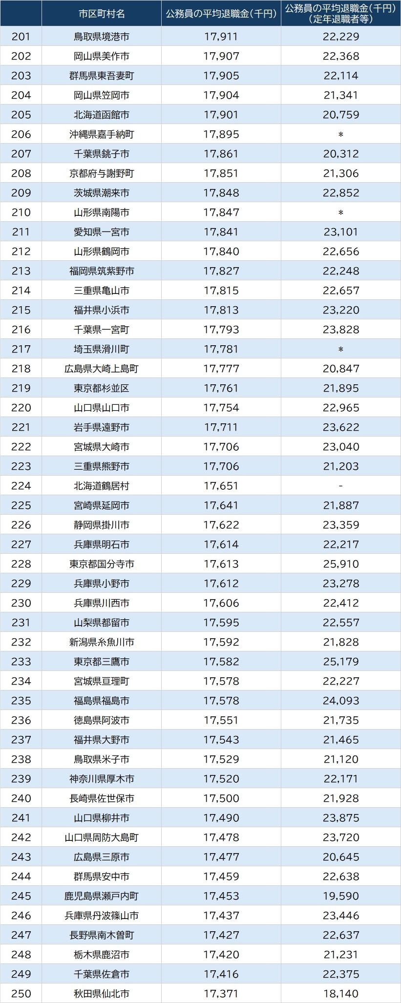 市区町村「公務員の平均給与」201~250位