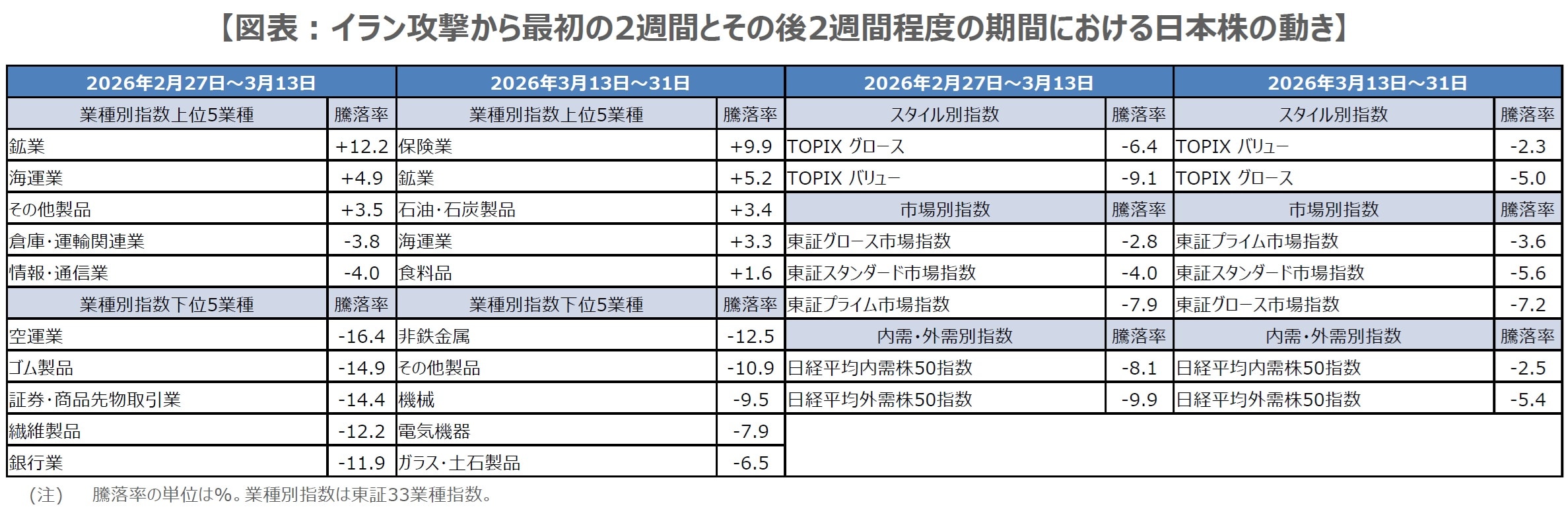 4月1日付レポートでは、世界の金融市場が、イラン攻撃から最初の2週間で「原油高、株安、債券安、米ドル高」で大きく反応をしたものの、その後2週間ほどで、いずれの反応も、その度合いが小さくなったことを検証しました。今回は、日本株に焦点をあて、最初の2週間(2月27日から3月13日)と、その後(3月13日から31日)の期間で、目立った変化がみられたか否かを確認します。