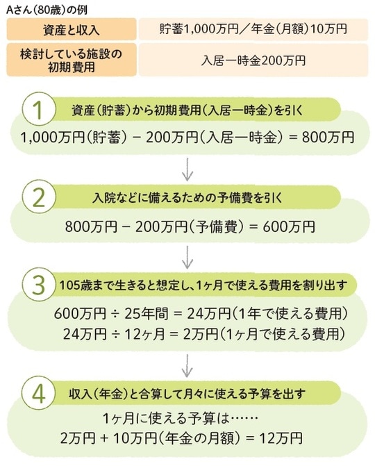資産と収入、施設入居の初期費用から月々使える予算を計算してみましょう。