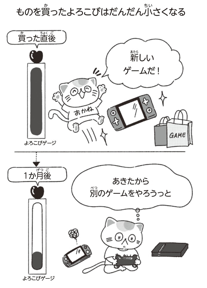 どんなにほしかったゲームも、買ってから1か月もすれば「当たり前」になって、あきてしまいますよね。買ってもらった直後はあんなにうれしかったのに、時間がたつと「もうあきたから次のゲームをやろうっと」と、どうでもよくなってしまいます。