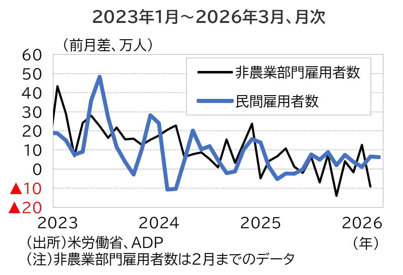 3月の米ADP雇用統計では、民間雇用者数が前月差+6.2万人と市場予想(同+4.0万人)を上回り、増加基調を維持しました(図表3)。