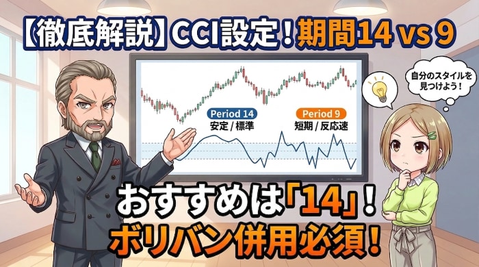 俺のおすすめは、まず期間14で始めること。CCIの挙動に慣れてきたら期間9に変えてみて、どちらが自分のトレードスタイルに合うか100回のデモトレードで検証する。いきなり period 9にすると、ダマシに振り回されて何が正しいシグナルかわからなくなるからな。