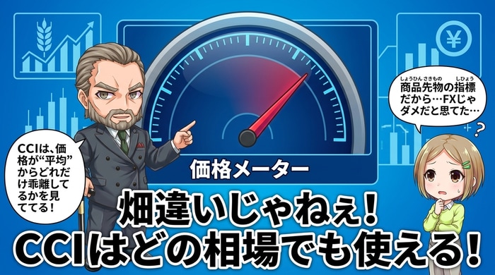 そう思うのは自然だ。でもな、CCIが見ているのは「価格が平均からどれだけ離れているか」。これは小麦の値段でもドル円のレートでも全く同じだ。相場の"万有引力"みたいなもんだよ。