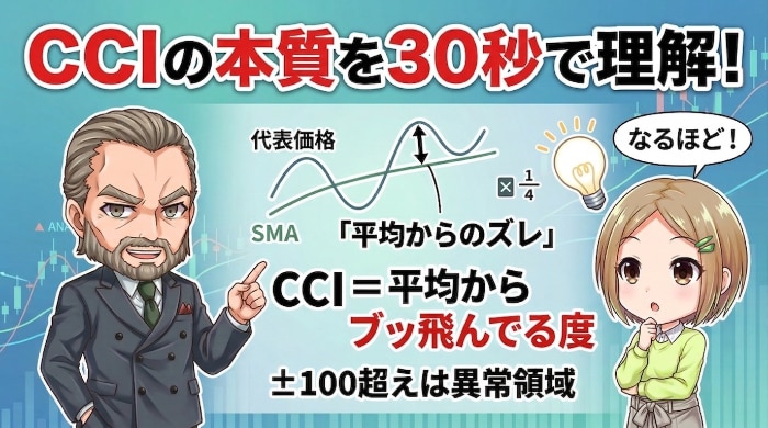 つまりCCIの本質は「今の価格が、いつもの値動きからどれだけブッ飛んでいるか」を一目で教えてくれるメーターだ。車のスピードメーターが「制限速度をどれだけ超えているか」を教えてくれるのと同じ原理だと思え。