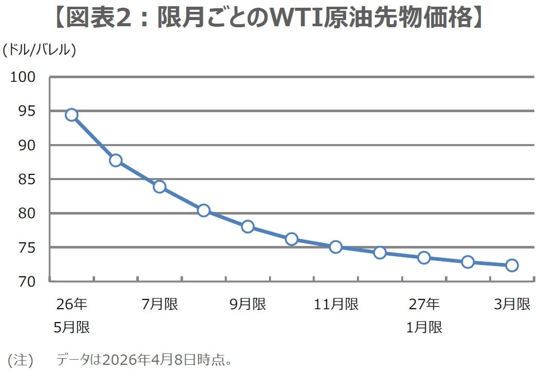前述のイランメディアが報じた通り、ホルムズ海峡の封鎖が続き、通航量が回復しなかった場合、原油価格の高止まりや、さらなる上昇といったことも予想され、日本株へのマイナスの影響も再び強まる恐れがあります。ただ、WTI原油先物の限月(げんげつ、先物取引の期限が満了する月)をみると、直近5月限(ごがつぎり)の価格は高水準にあるものの、期先の限月価格の上昇は、比較的抑制されていることが分かります(図表2)。