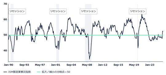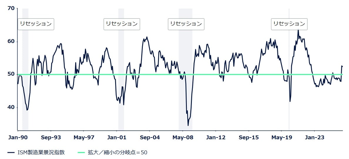 ISM米製造業購買担当者景気指数(PMI)は足元で52.4と、2ヵ月連続で50超の拡大圏を維持し、2022年以来の高水準に達しています。これは、2022~2025年の米国史上最も長い収縮期を経ての回復です(図表1)。前回のサイクルでは、同指数は2021年3月に63.8でピークを付けました※3。